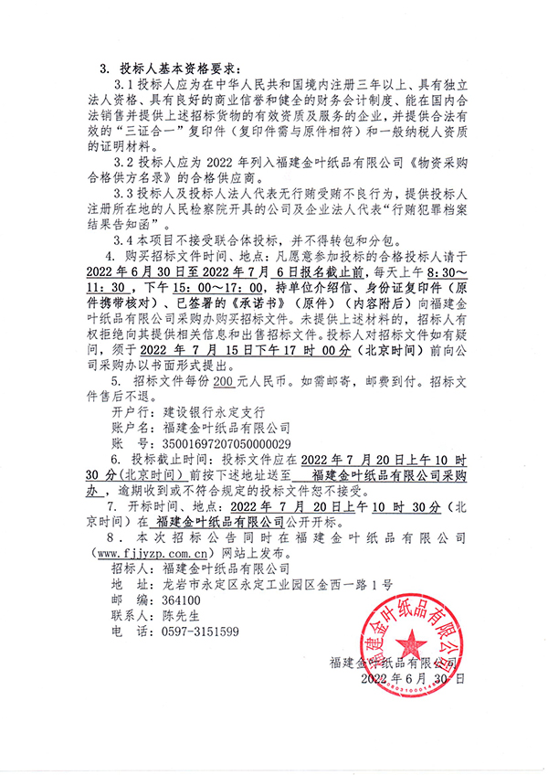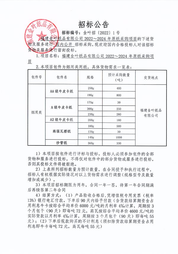 金葉紙品2022—2024年度原紙采購(gòu)項(xiàng)目招標(biāo)公告