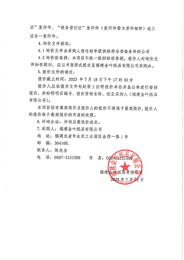福建金葉紙品有限公司吹塑托盤采購項目詢價公告