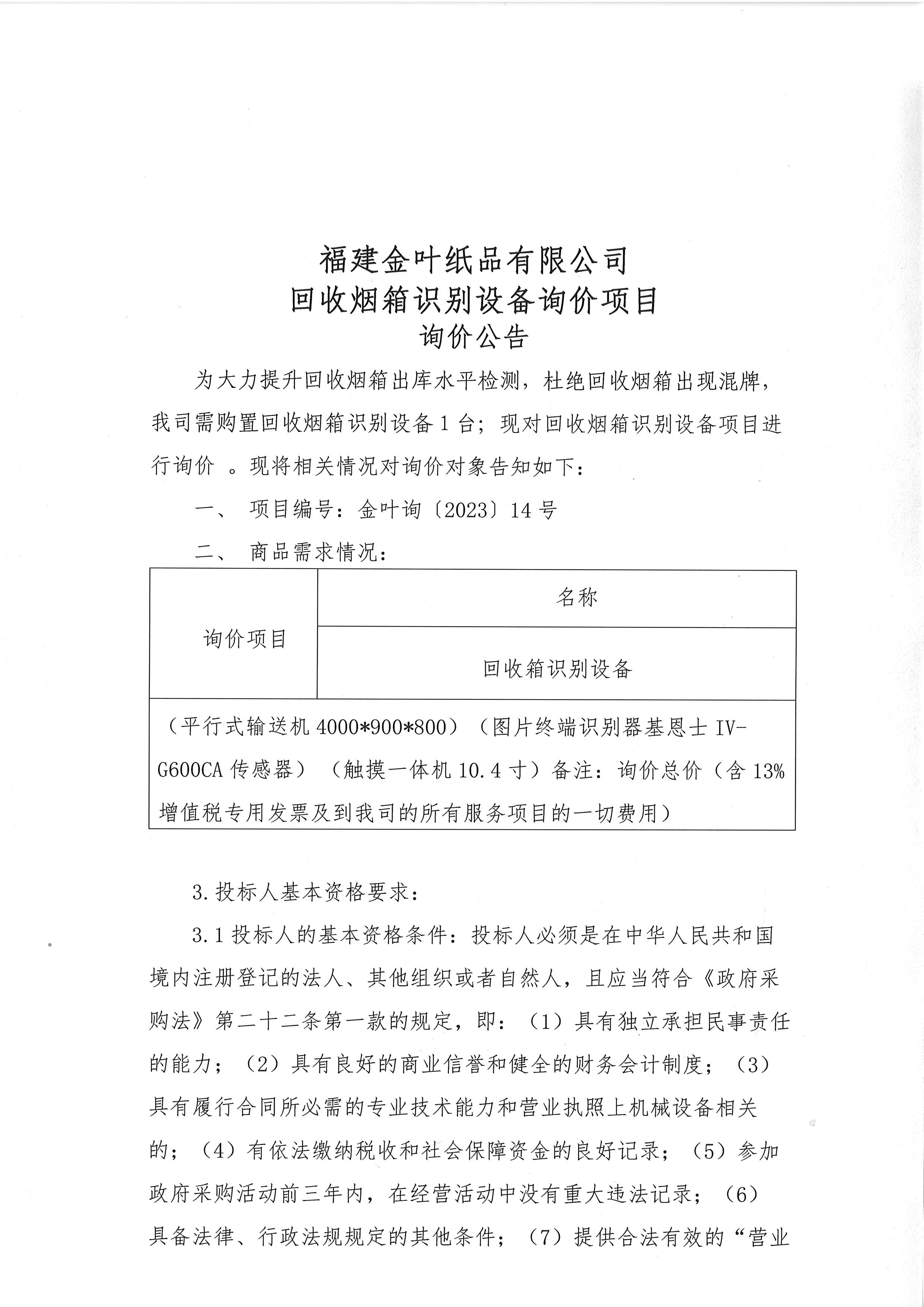 福建金葉紙品有限公司回收煙箱識別設(shè)備詢價項目